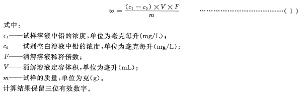 試樣中總鉛含量以鉛元素的質量分數(shù)ω計,數(shù)值以毫克每千克(mg/kg)表示,按式(1)計算