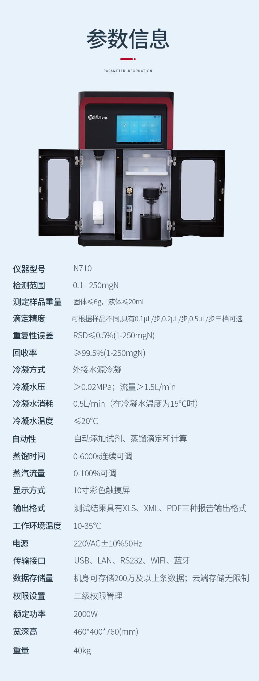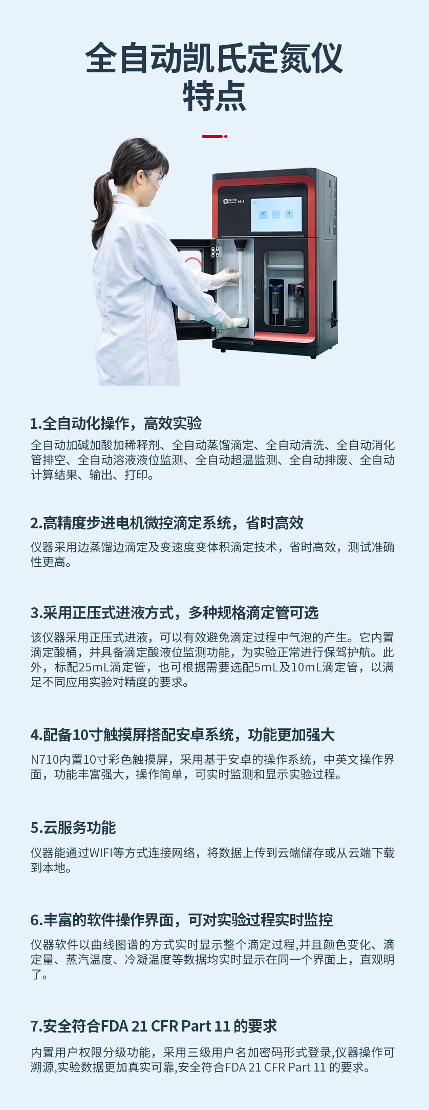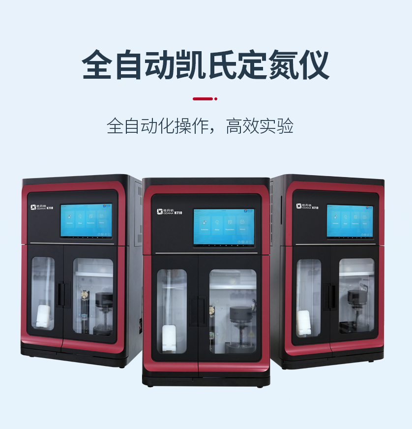 新一代N710全自動(dòng)凱氏定氮儀集成了自動(dòng)加堿加酸、自動(dòng)加稀釋劑、蒸餾滴定、消化管排空、溶液液位監(jiān)測(cè)、超溫監(jiān)測(cè)、清洗排廢、結(jié)果計(jì)算等功能。采用符合國(guó)家標(biāo)準(zhǔn)的凱氏定氮方法:濃硫酸環(huán)境消解樣品、堿性環(huán)境蒸汽蒸餾、硼酸吸收、加指示劑滴定、終點(diǎn)顏色判定法。