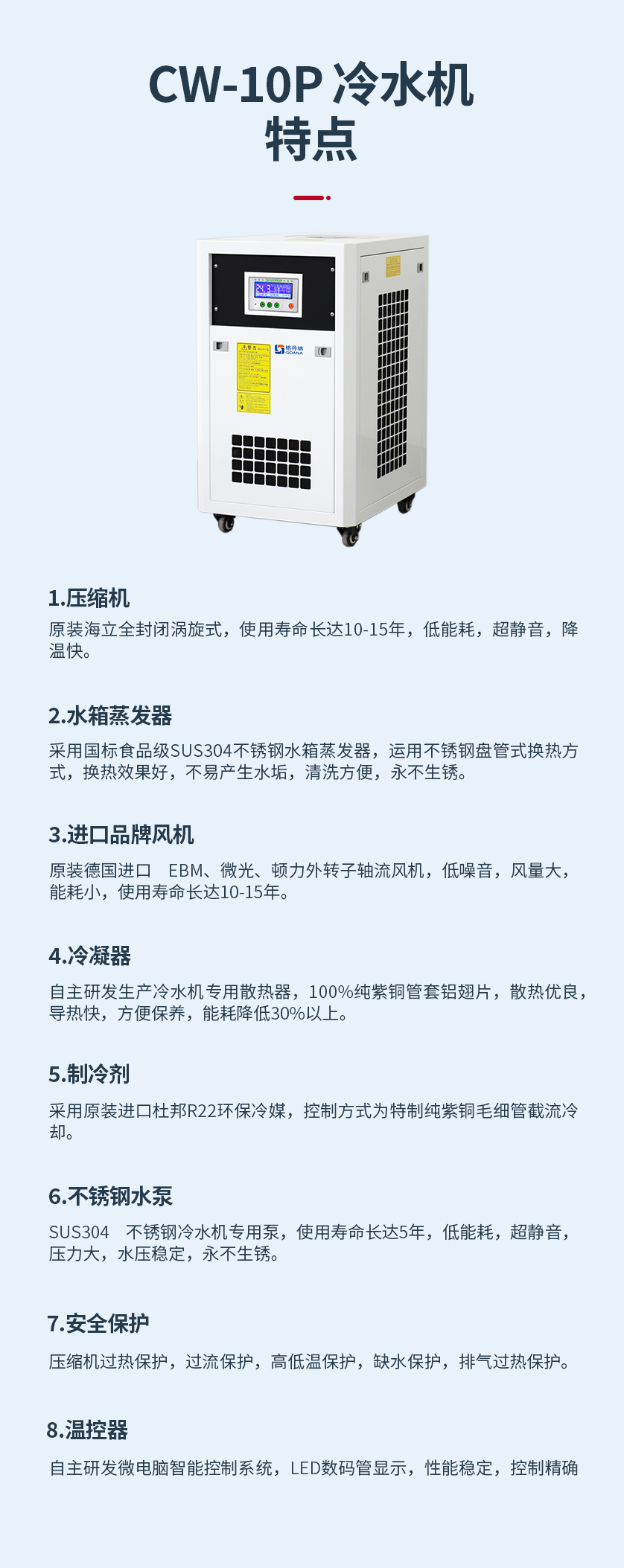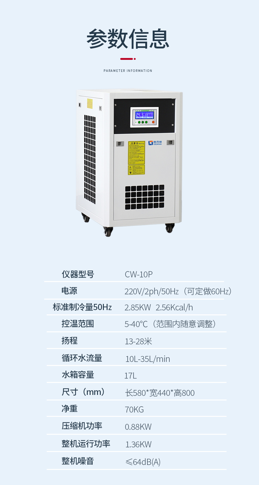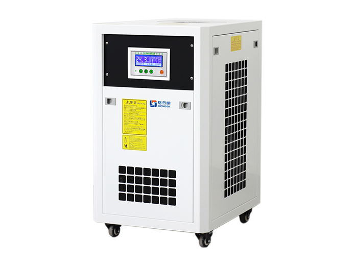 冷水機制冷系統(tǒng)將水箱內(nèi)的水冷卻,而后機器內(nèi)部的水泵把低溫的水注入需要冷卻的設(shè)備內(nèi)。水帶走機器內(nèi)部的熱量,變成高溫的水后回流到水箱進行降溫,如此循環(huán)交換冷卻,起到為設(shè)備冷卻的作用。