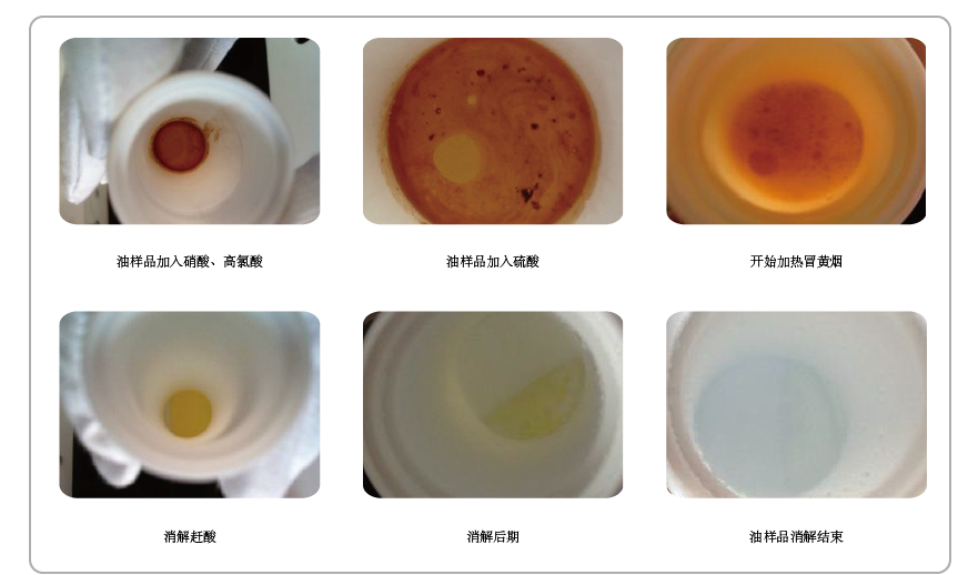 智能消解儀上進行濕法消解,各類油脂消解可在1天內完成。儀器將劇烈的實驗反應變成可控狀態(tài):儀器自動加入三種濃酸,樣品混勻,低溫冷消,浸泡過夜自動開啟,之后再自動程序升至高溫消解,在樣品回復室溫后完成定容,全部實現(xiàn)自動化,增加了樣品消解的成功率,避免了人員的危險,提高了實驗效率。