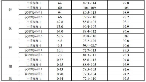 11.4 每批次樣品至少分析 10% 的加標(biāo)回收樣,樣品數(shù)量小于 10 個時,應(yīng)至少做一個加標(biāo) 回收樣。加標(biāo)回收樣測定結(jié)果中,電熱板消解測定鎘(Cd)、鈷(Co)、銅(Cu)、鉻(Cr)、 錳(Mn)、鎳(Ni )、鉛(Pb)、鋅(Zn)、釩(V)、砷(As)的加標(biāo)回收率應(yīng)控制在 70% ~ 125%之間,鉬(Mo)、銻(Sb)的加標(biāo)回收率應(yīng)控制在 50% ~125%之間;微波消解測定 12 種金屬元素的加標(biāo)回收率應(yīng)控制在70% ~125%之間。