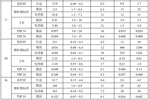 濾膜質(zhì)控樣品由美國(guó)職業(yè)健康研究所提供(A-3.1)。顆粒物標(biāo)樣為美國(guó) NIST(1648a)。 樣品消解處理采用硝酸-鹽酸混合溶液(5.6),定容體積為 50.0 ml。不同類型樣品測(cè)定值濃 度(或含量)單位分別為:質(zhì)控樣(μg )、顆粒物標(biāo)樣(μg/g)、飛灰樣品(μg/g)和 TSP 樣品(μg/cm 2 )。其中顆粒物標(biāo)樣中 Al 、Ca、K 元素含量單位為重量百分比(% )。