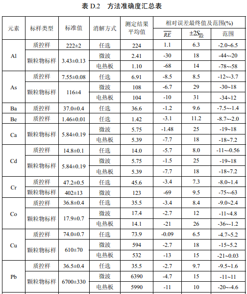 本附錄各消解體系操作步驟經(jīng)本標(biāo)準(zhǔn)主編單位驗(yàn)證。大氣顆粒物標(biāo)樣硝酸-氫氟酸-高氯 酸全量消解體系測(cè)定結(jié)果見表E.1。