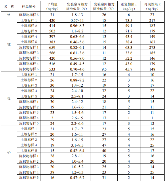 11.3 每批次樣品至少按10%的比例進行平行雙樣測定,樣品數(shù)量少于10個時,應至少測定一個平行雙樣。平行雙樣測定結果中,電熱板消解測定鈷(Co)、銅(Cu)、鉻(Cr)、錳(Mn)、鎳(Ni)、鉛(Pb)、鋅(Zn)、釩(V)、砷(As)的相對偏差應小于30%,鎘(Cd)、鉬(Mo)、銻(Sb)的相對偏差應小于40%;微波消解測定12種金屬元素的相對偏差應小于30%。