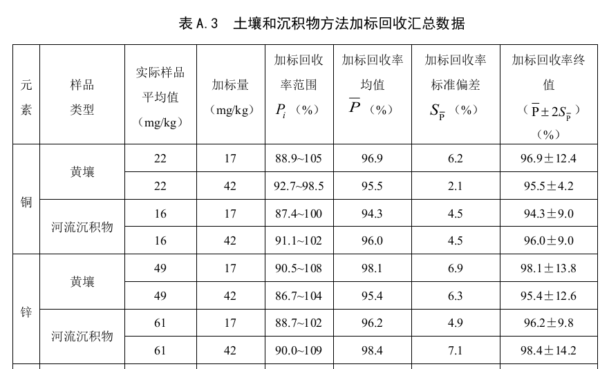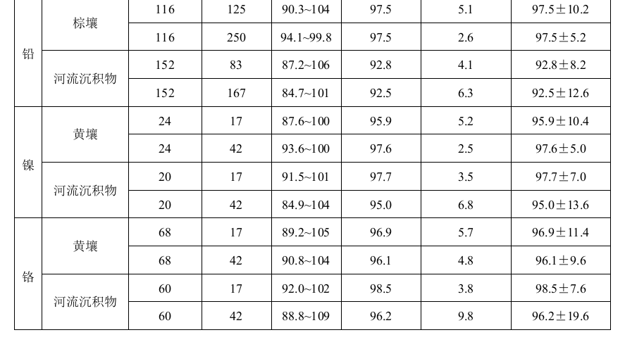 本標(biāo)準(zhǔn)適用于土壤和沉積物中銅、鋅、鉛、鎳和鉻的測定。當(dāng)取樣量為0.2g、消解后定容體積為25 ml時,銅、鋅、鉛、鎳和鉻的方法檢出限分別為1 mg/kg、1 mg/kg、10 mg/kg、3 mg/kg和4 mg/kg,測定下限分別為4 mg/kg、4 mg/kg、 40 mg/kg、12 mg/kg和16 mg/kg。