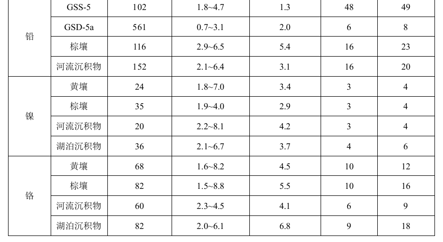 六家實驗室分別對有證標(biāo)準(zhǔn)樣品GSS-5和GSD-5a中的鉛進(jìn)行了6次重復(fù)測定:相對誤差范圍分別為-0.5%~3.0%和-1.9%~2.9%;相對誤差最終值分別為1.7%±2.8%和 0.3%±4.2%。 六家實驗室分別對有證標(biāo)準(zhǔn)樣品GSS-12、GSS-5、GSS-9和GSD-5a中的鎳進(jìn)行了6次重復(fù)測定:相對誤差范圍分別為-2.9%~1.2%、-8.9%~6.0%、-8.0%~6.1%和-2.2%~1.6%;相對誤差最終值分別為-1.4%±3.0%、-4.1%±11.6%、-1.5%±11.0%和-0.6%±3.0%。 六家實驗室分別對有證標(biāo)準(zhǔn)樣品GSS-12、GSS-5、GSS-9和GSD-5a中的鉻進(jìn)行了6次重復(fù)測定:相對誤差范圍分別為-2.2%~2.8%、-4.2%~-0.8%、-4.5%~0.4%和-2.1%~2.4%;相對誤差最終值分別為0.4%±4.0%、-2.6%±2.6%、-2.3%±4.0%和0.3%±3.8%。