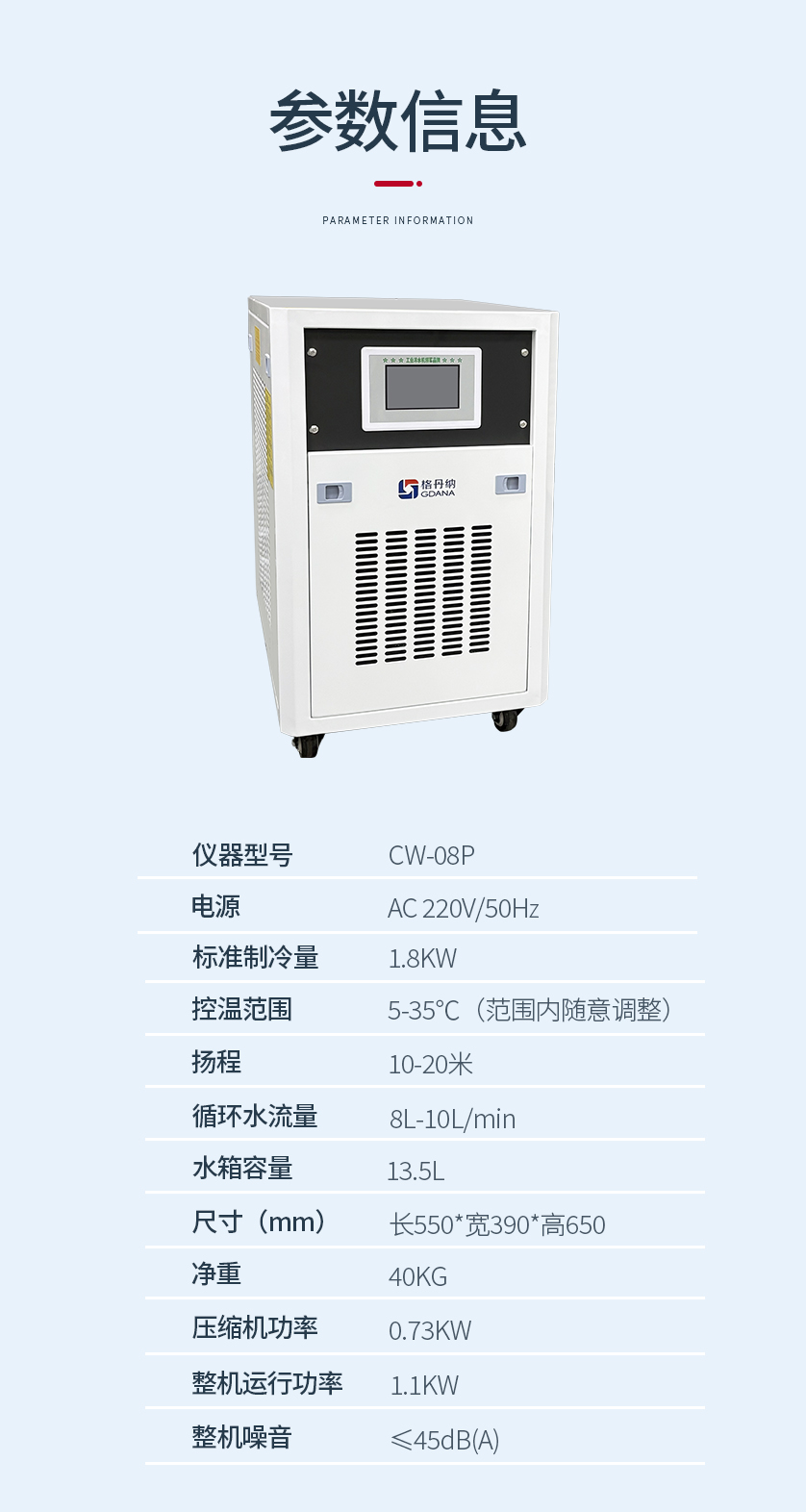 冷水機制冷系統(tǒng)將水箱內(nèi)的水冷卻,而后機器內(nèi)部的水泵把低溫的水注入需要冷卻的設備內(nèi)。水帶走機器內(nèi)部的熱量,變成高溫的水后回流到水箱進行降溫,如此循環(huán)交換冷卻,起到為設備冷卻的作用。