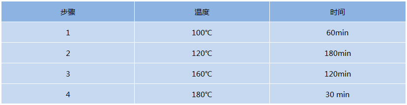 稱(chēng)取0.2g(精確至0.1mg)樣品于聚四氟解管中,用少量水潤(rùn)濕;加入5ml鹽酸。打開(kāi)平板啟動(dòng)設(shè)置好的程序開(kāi)始加熱(消解程序下如表),100℃消解保持60min;加5ml硝酸、5ml氫氟酸、1ml高氯酸,加蓋,120℃消解保持180min;開(kāi)蓋,160℃消解保持120min;最后溫度提高到180℃趕酸,當(dāng)加熱至冒濃厚高氯酸白煙時(shí),加蓋,待消解管壁上的黑色有機(jī)物消失后,開(kāi)蓋,驅(qū)趕白煙并蒸至內(nèi)容物呈不流動(dòng)狀態(tài)的液珠狀。用1%硝酸溫?zé)崛芙饪扇苄詺堅(jiān)?,轉(zhuǎn)移至25ml容量瓶中定容,搖勻,待測(cè)。同時(shí)做空白樣品。
