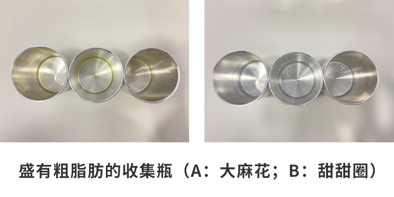 本次實驗測得大麻花樣品中的粗脂肪含量為24.08%,甜甜圈樣品中的粗脂肪含量為4.62%,且在重復性條件下獲得的兩次獨立測定結果的絕對差值未超過算術平均值的10%。
